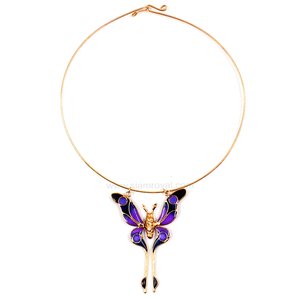 Inspired by Nature's butterflies, this colorful medium butterfly necklace is crafted from handpainted resin wngs and gold plated Betel nut body and gold plated Fern leaf antennae.