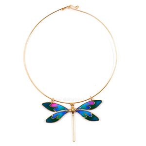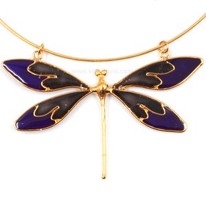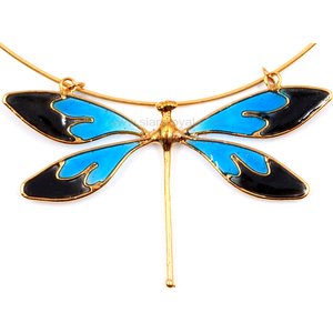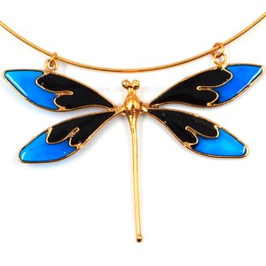A delicate Botanic Dragonfly necklace made from gold plated pepercorn eyes, Peacock flower bud body, stamen abdomen and colorful resin wings.
