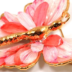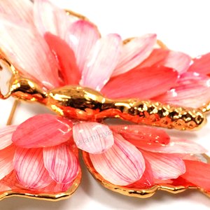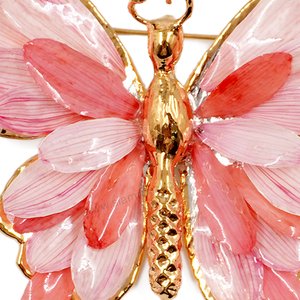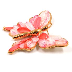 Silver and gold plated Bird's Nest Fern cut into butterfly shape as base is layered with colored Aster Petals in 3D style, preserved in of tamarind fruit fibers, a head of Oncidium orchid bud, mid section of a small betel nut and an bdomen of lantana flower receptacle. Aster Petal colors can be changed.