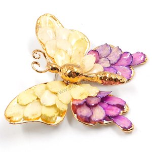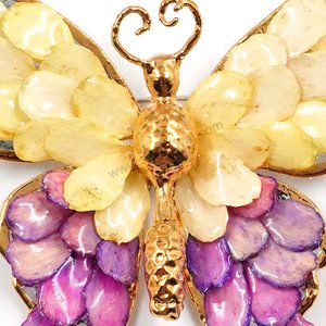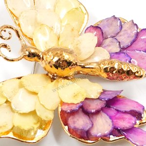 Silver and gold plated Bird's Nest Fern cut into butterfly shape as base is layered with delicate Zinnia Petals in assorted colors in 3D style; preserved in flexible, clear coating. The Gold Plated Butterfly body has antennae of tamarind fruit fibers, a head of Oncidium orchid bud, mid section of a small betel nut and an abdomen of lantana flower receptacle. Zinnia Petal colors can be changed.