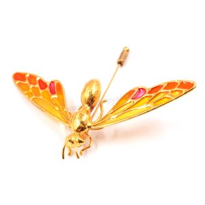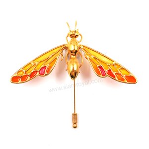 A Botanic Wasp in Art Deco style, this colorful partly gold plated Wasp is crafted into a stickpin from handpainted resin wings, gold plated Peppercorn eyes, abdomen and body of gold plated Betel nut. No two stickpins are exactly alike. (Legs of gold plated wire work.)