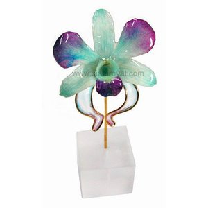 Real Dendrobium orchid on fanciful, colorful wirework. Comes with resin stand and individual packing box. Color wirework will compliment orchid color and will vary from piece to piece. Please note that large Dendrobium orchids used for designs #1, 5 and 6 are available only in 2 tone color schemes of "purple+ another color". Please refer to color chart below.