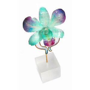 Real Dendrobium orchid on fanciful, colorful wirework. Comes with resin stand and individual packing box. Color wirework will compliment orchid color and will vary from piece to piece. Please note that large Dendrobium orchids used for designs #1, 5 and 6 are available only in 2 tone color schemes of "purple+ another color". Please refer to color chart below.
