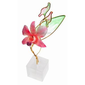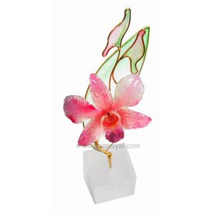 Real Dendrobium orchid on fanciful, colorful wirework. Comes with resin stand and individual packing box. Color wirework will compliment orchid color and will vary from piece to piece. Please note that large Dendrobium orchids used for designs #1, 5 and 6 are available only in 2 tone color schemes of "purple+ another color". Please refer to color chart below.